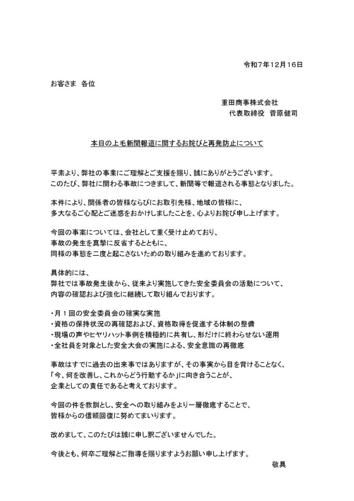 本日の上毛新聞報道に関するお詫びと再発防止について